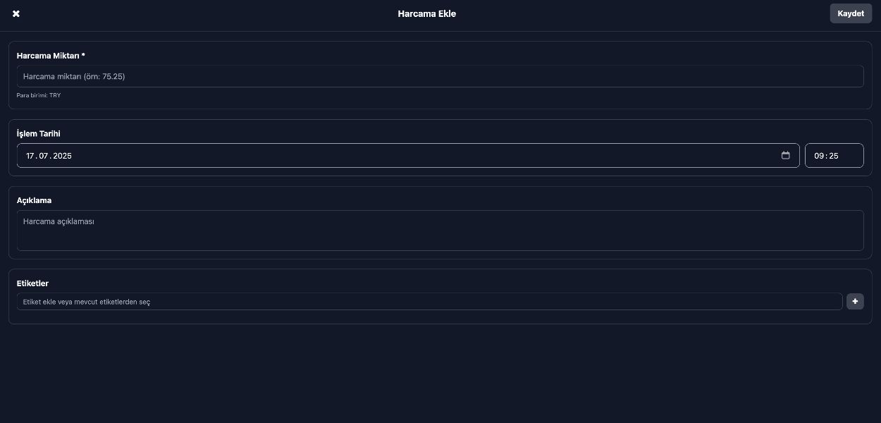 - Etiketler: Harcamanın hangi etiketlere ait olduğunu seçin veya yeni bir etiket girin (örneğin, market, fatura, eğlence, vb.).